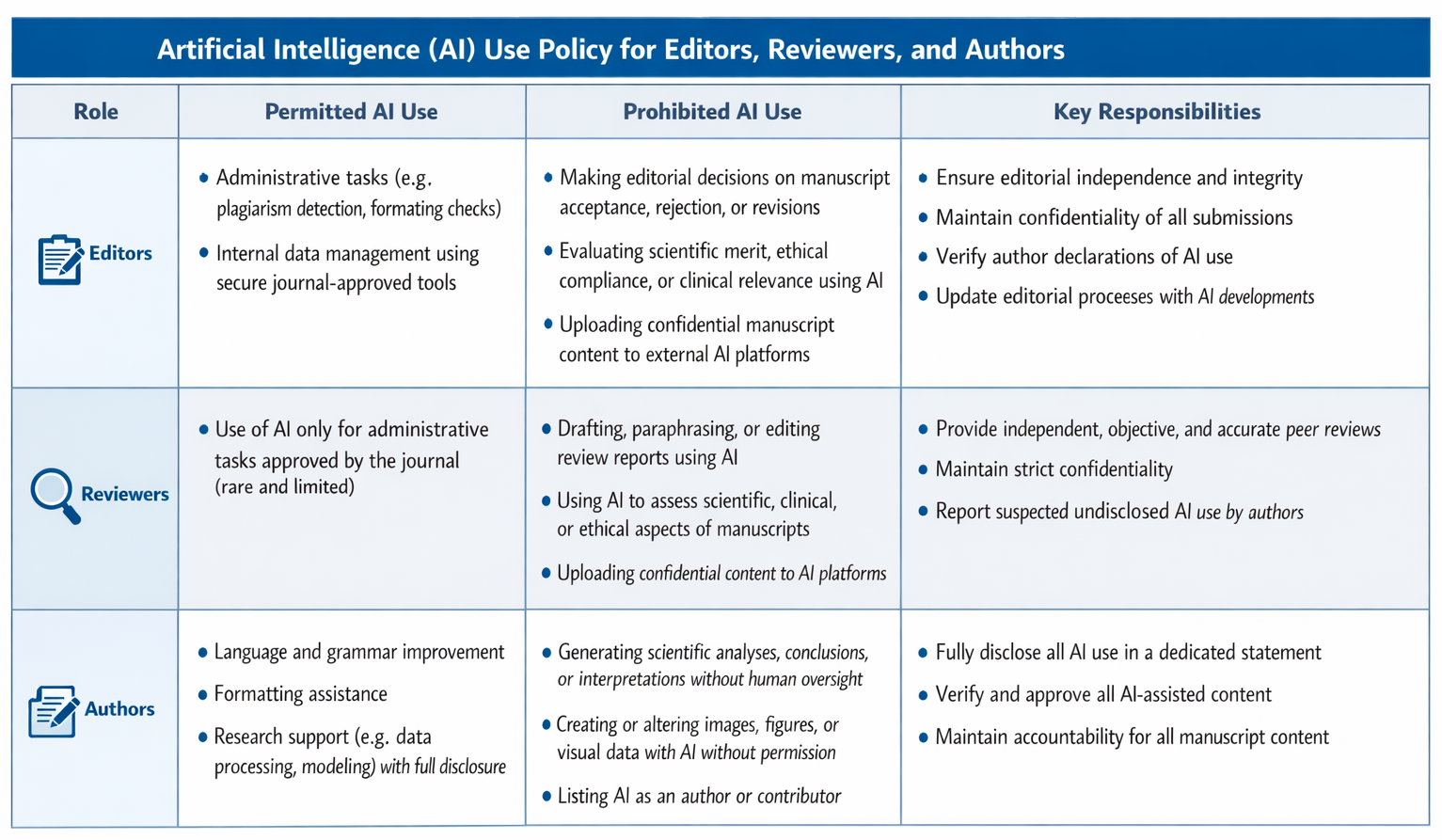 - AI must not be used to make decisions about manuscript quality, ethical compliance, or scientific relevance.